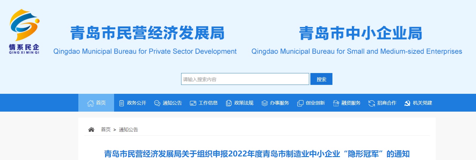 為深入推進(jìn)實(shí)體經(jīng)濟振興,引導中小企業(yè)以“專(zhuān)精特新”為路徑、以“隱形冠軍”為目標,專(zhuān)注創(chuàng )新和產(chǎn)品質(zhì)量提升,增強核心競爭力,實(shí)現高質(zhì)量發(fā)展,根據《青島市人民政府印發(fā)關(guān)于貫徹落實(shí)省支持八大發(fā)展戰略財政政策加快重點(diǎn)產(chǎn)業(yè)高質(zhì)量發(fā)展若干政策的通知》(青政字〔2021〕21號)、《青島市民營(yíng)經(jīng)濟發(fā)展局 青島市財政局關(guān)于印發(fā)<青島市培育和獎勵隱形冠軍企業(yè)、專(zhuān)精特新“小巨人”企業(yè)、瞪羚企業(yè)、獨角獸企業(yè)實(shí)施方案(2019-2022年)>的通知》(青民發(fā)字〔2019〕36號),我局決定開(kāi)展2022年度青島市制造業(yè)中小企業(yè)“隱形冠軍”申報工作?,F將有關(guān)事項通知如下: