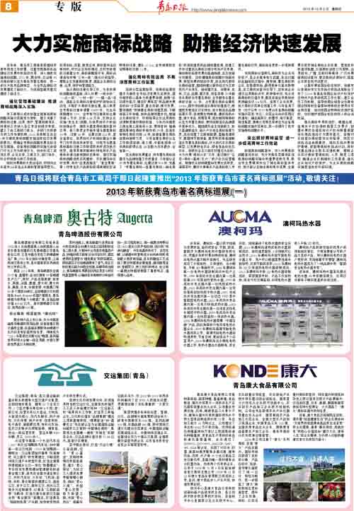 近年來(lái),青島市工商局緊緊圍繞市委市政府工作部署,注重發(fā)揮商標在品牌經(jīng)濟發(fā)展中的驅動(dòng)作用,深入推進(jìn)實(shí)施商標戰略,2013年,奧古特、交運等90件商標被認定為青島市著(zhù)名商標,進(jìn)一步壯大我市品牌陣容,為全市品牌經(jīng)濟發(fā)展增添了新動(dòng)力,為創(chuàng )新型城市建設增添了新活力
